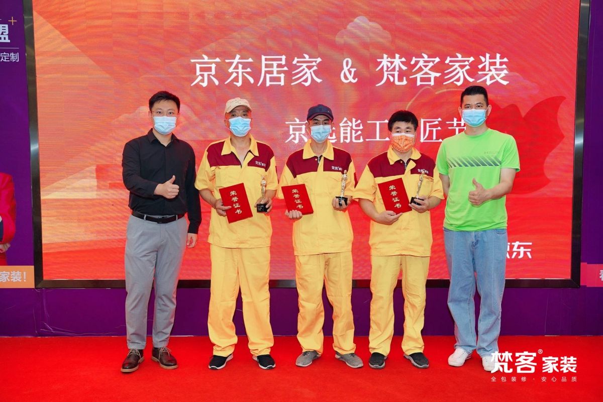 梵客家裝三位優(yōu)秀的工長水電工劉五九,油工潘飛,泥木龔榮明,更是被京東居家分別評(píng)選為“京選能工巧匠水電工程金指獎(jiǎng)”、“京選能工巧匠油漆工程金匠獎(jiǎng)”、“京選能工巧匠泥木工程金巧獎(jiǎng)”,并獲得獎(jiǎng)杯和榮譽(yù)證書。