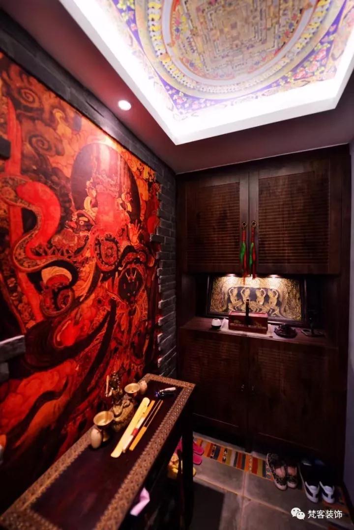 玄關(guān)做了裝飾,壁畫選用客戶自己去法海寺拍攝的廣目天王圖案;