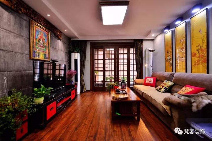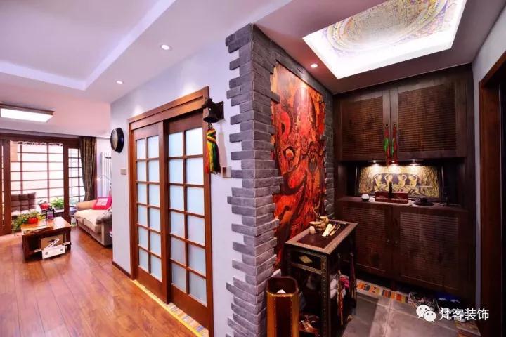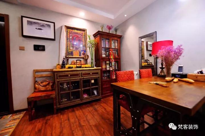? 電視背景墻上的唐卡是客戶多年前去西藏朋友贈(zèng)送的,裝飾木質(zhì)雕花是有些年頭的老舊物件,在高碑店古典家具一條街淘來(lái)的。