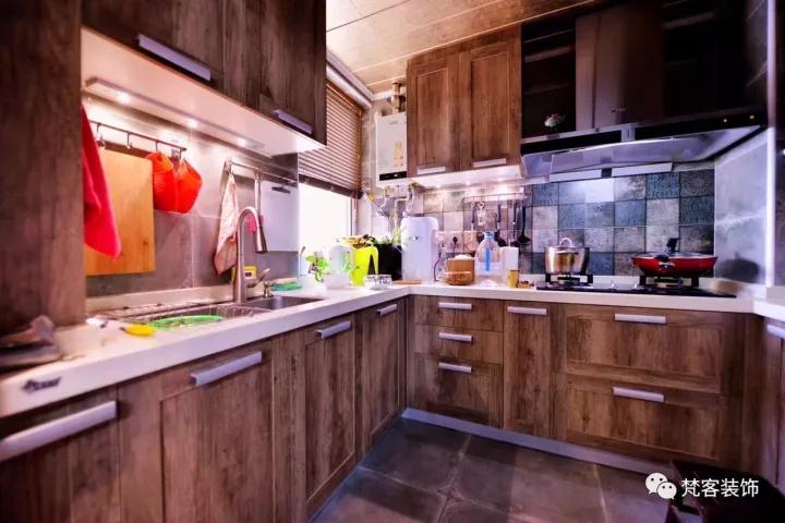 廚房具有得天獨(dú)厚的采光優(yōu)勢(shì),可以考慮用深色系打造整個(gè)空間,延續(xù)復(fù)古風(fēng)格。以原木紋理的櫥柜搭配灰色墻磚、甲骨文花片,整個(gè)空間就是現(xiàn)代與古典的交融。