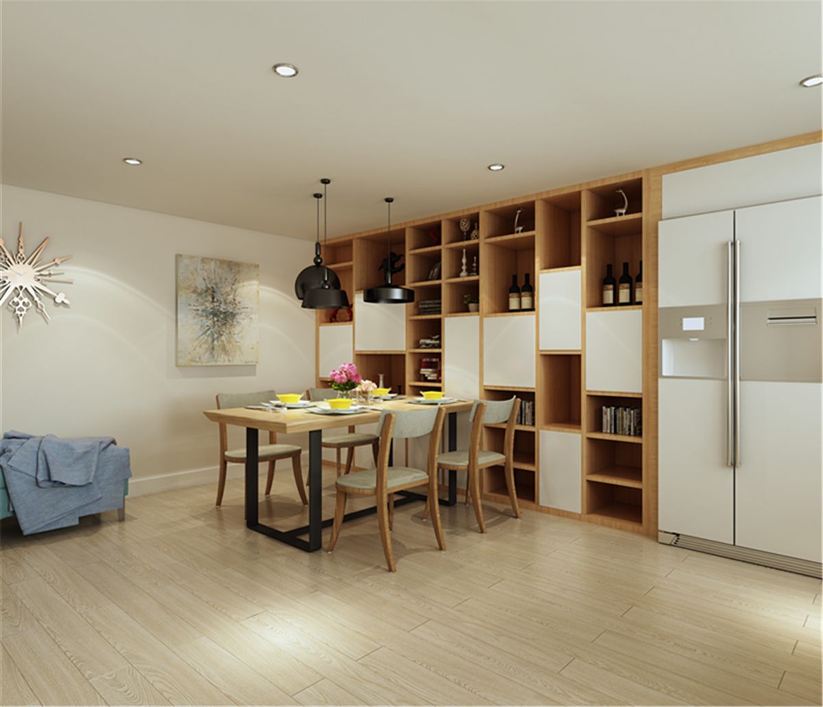 餐邊柜設計比較復雜,餐桌就選了極簡風格,一重一輕搭配更和諧。吊燈與筒燈的共同使用,也滿足了多樣化照明。
