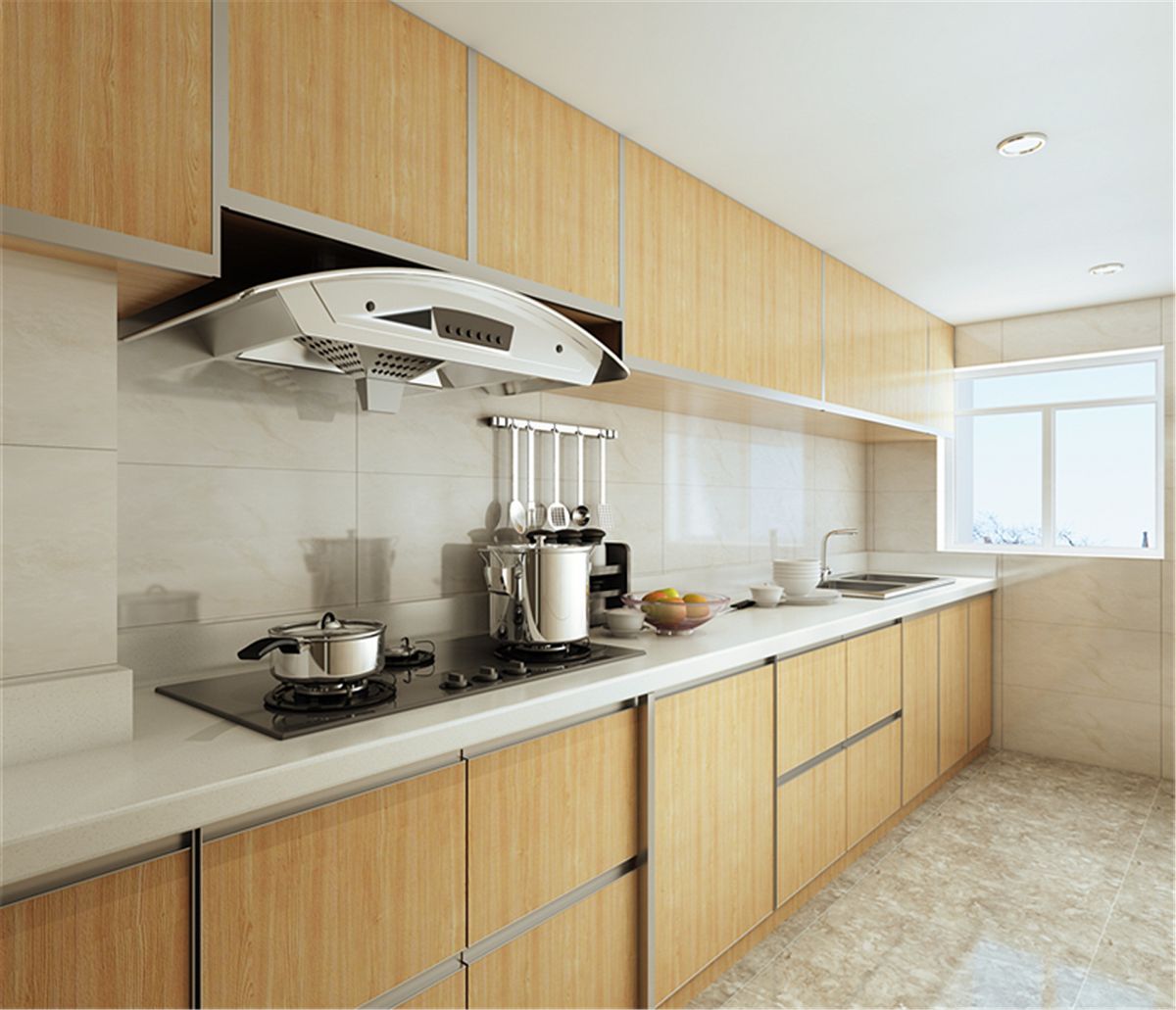 廚房面積不大,采用一字型:水槽、操作臺、灶臺一字排開,簡潔精煉,適合中小戶型狹長型廚房。