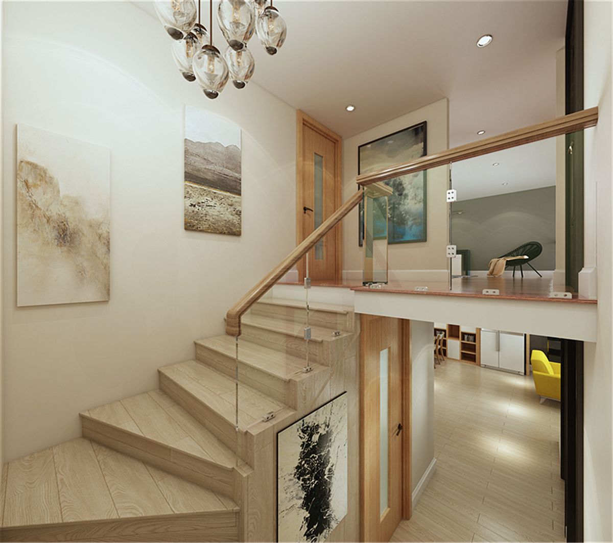 由1樓至2樓的護欄,用了玻璃和木護欄,增強了視覺通透性,也解決了采光的問題。