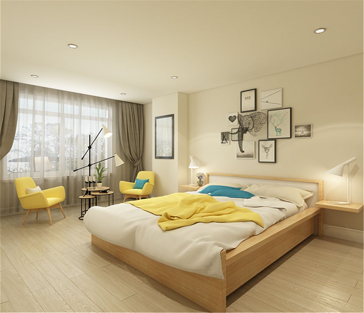 主臥的設計重點是光源,燈光不能太刺眼,還可根據居住者的需求增減光源。有的人不喜歡主光源,覺得太亮,可以用數個筒燈代替。床頭柜、休憩區,都可以布置光源,方便起夜。