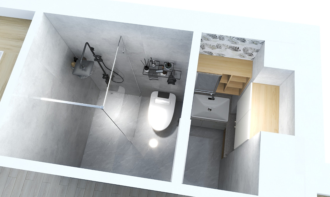 衛生間干濕分離:原結構中,衛生間的空間相對較大,但是功能布局不合理,洗手盆,坐便,淋浴區,洗衣機擺放無序,且無干濕分區。通過增加墻體隔斷,將洗手盆獨立出來,作為干區。坐便和淋浴區之間使用玻璃隔斷,再次分區,達到三分離的劃分,在提升使用率的同時,也可兼顧多人同時使用的便利。