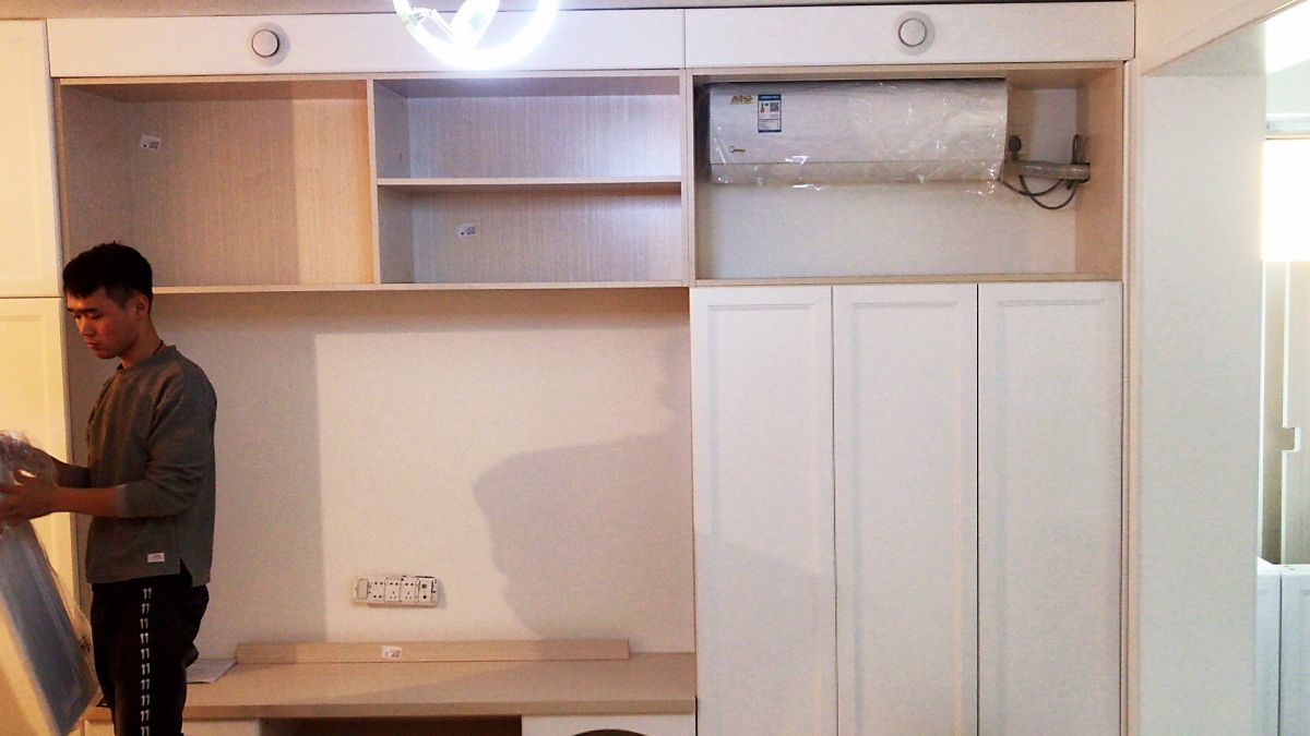 ↑ 客廳,收納柜與電視背景墻結合,將儲物做到極致。抽屜以及不同大小的柜子,方便各類物品的存放。嵌入式空調的設計,更整體統一 ,提升空間整潔度。